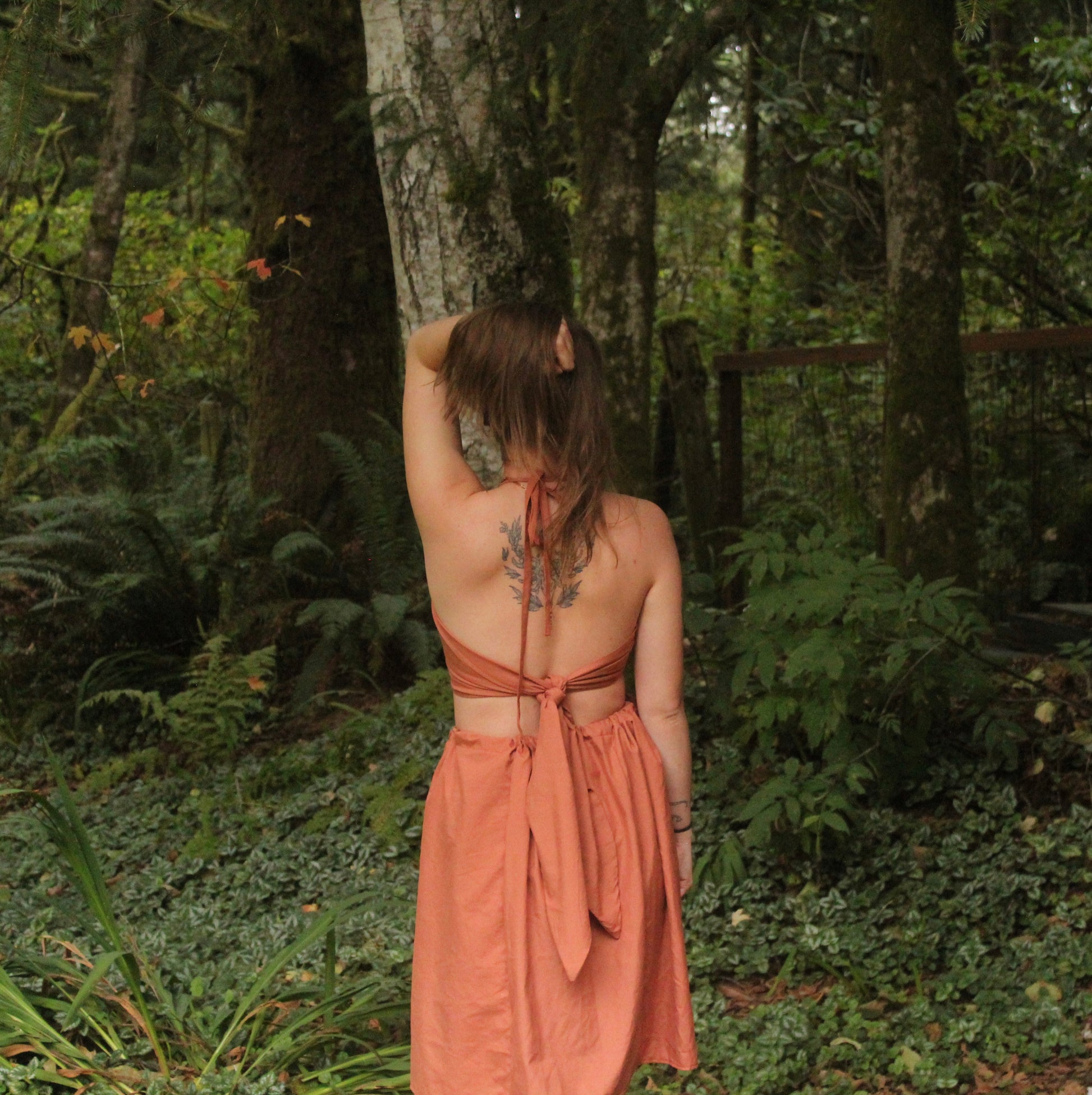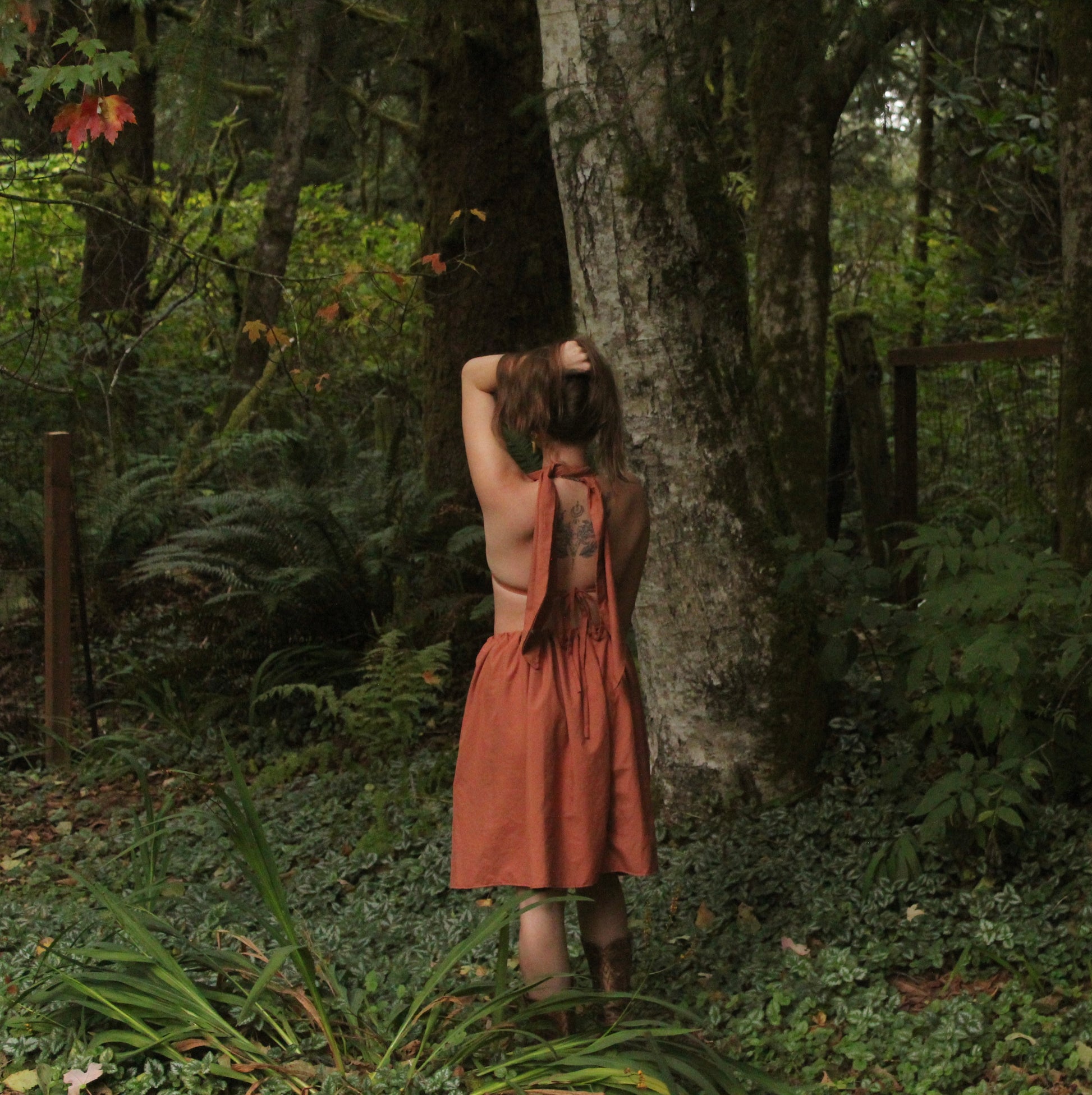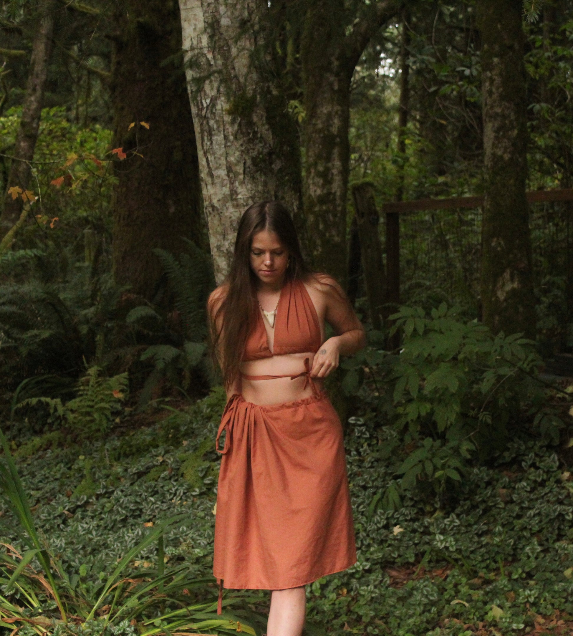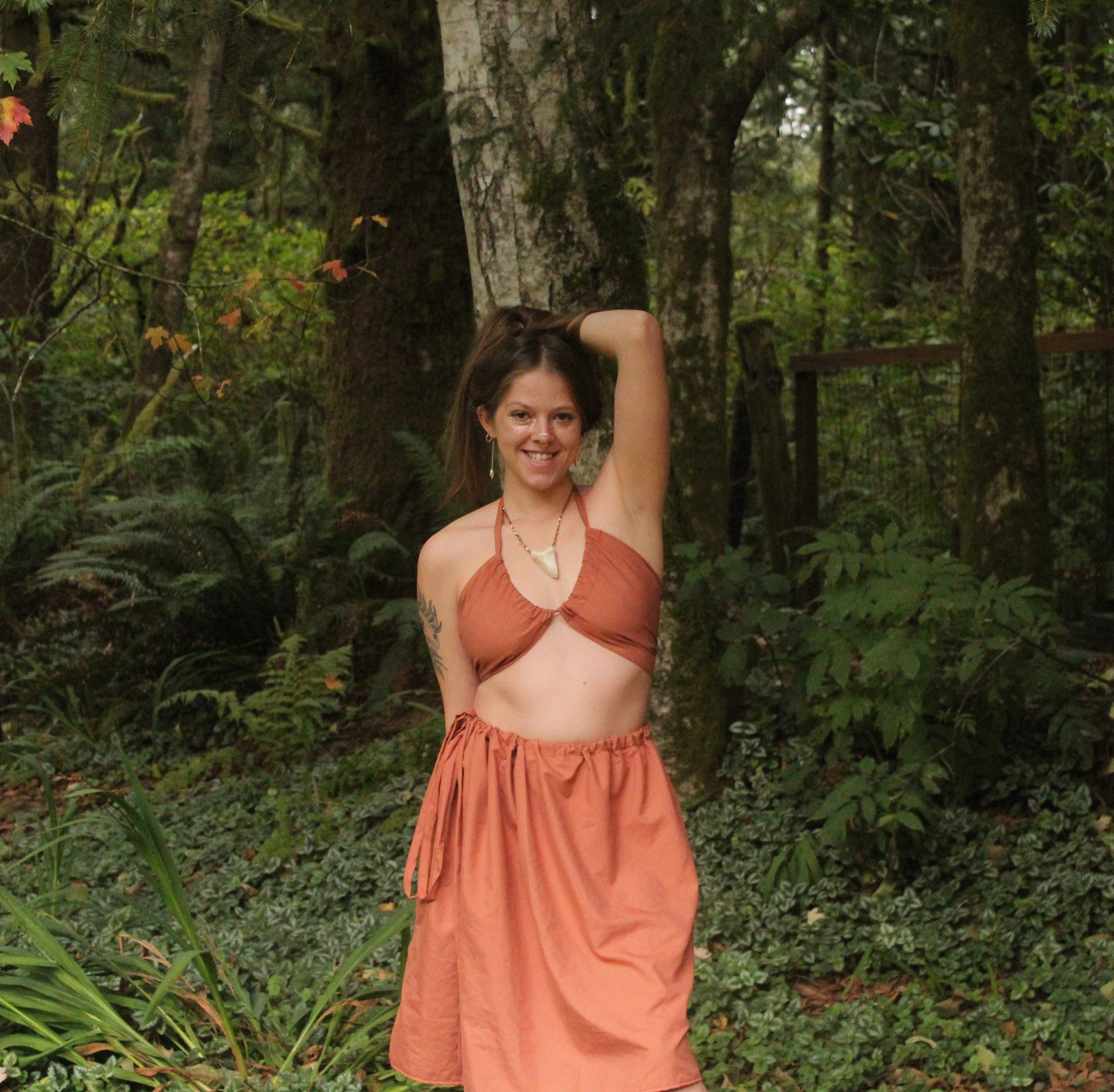 I created this clothing line with body positivity, sustainability and growth in mind. These shirts are a one size fits many as they are extremely adjustable and can be worn many ways, as are the skirts along side them. These pieces will last a lifetime and grow with you through all phases of life.