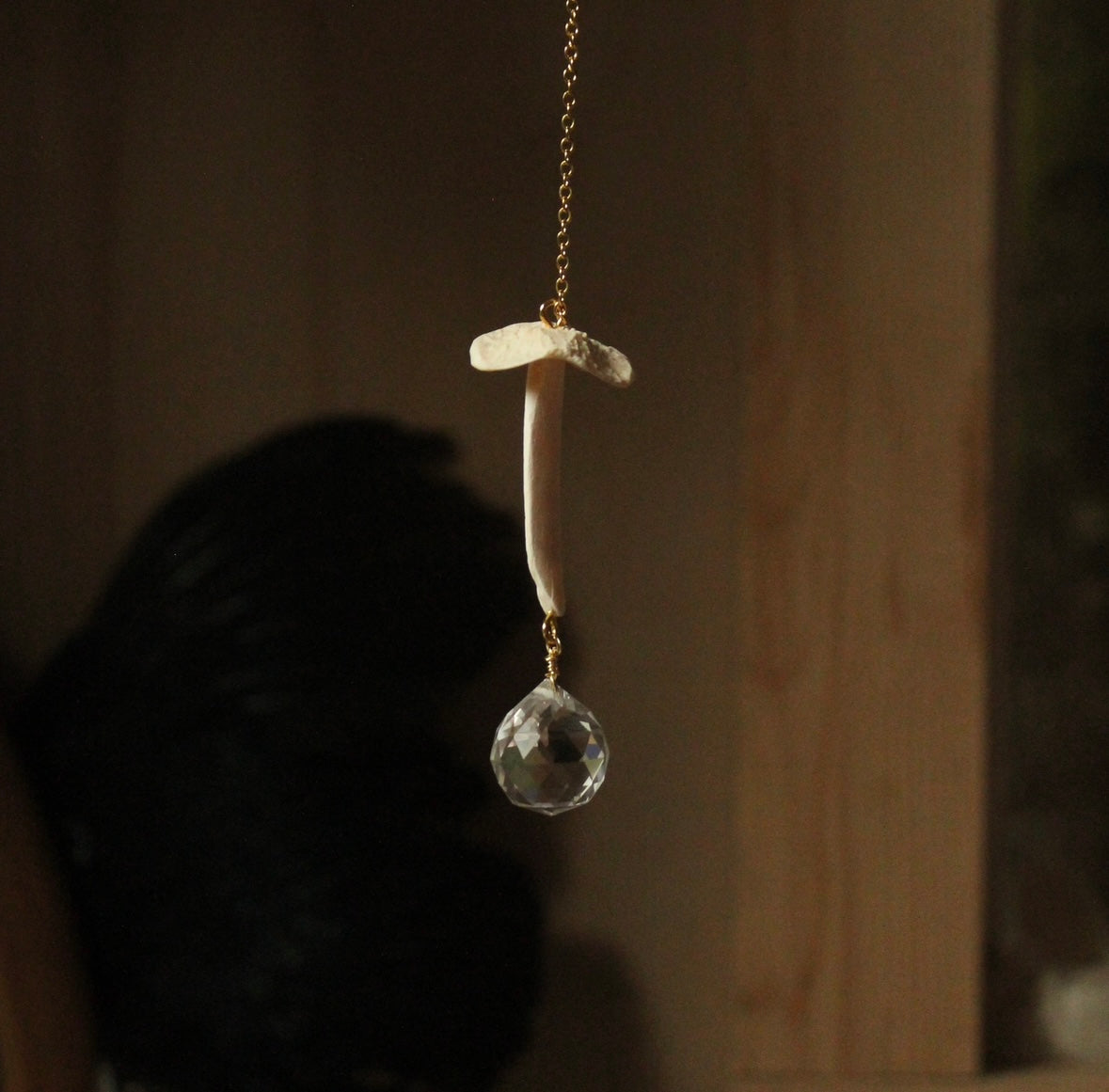 Two deer bones, a vertebrae cap as the mushroom cap & a carved bit of rib bone as the stem, all wrapped into on magical little suncatcher.