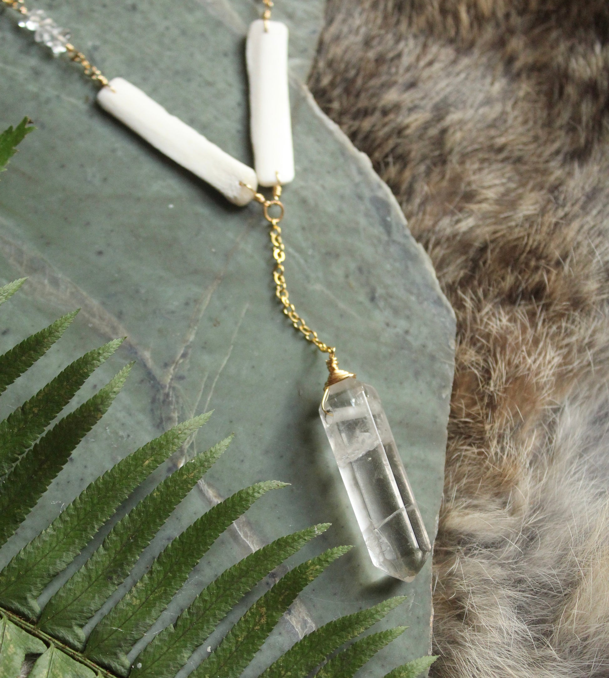 Two rectangle created from foraged deer ribs, wrapped and paired with a double pointed quarts centerpiece and several quartz details running up the chain. This is a lariat style necklace. 18-20” adjustable chain.
