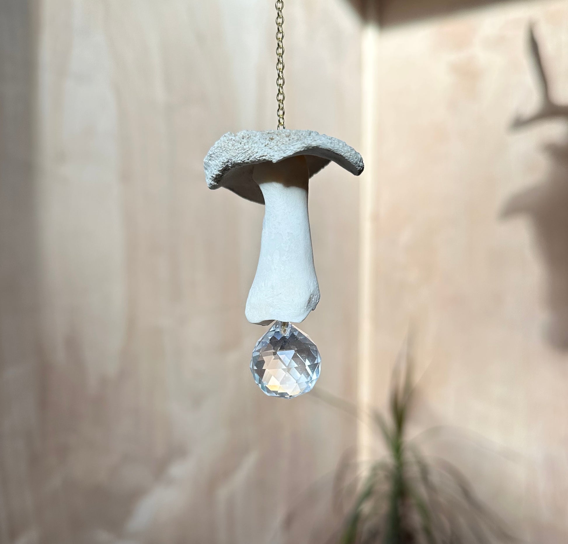 Two elk bones, a vertebrae cap as the mushroom cap & a toe bone as the stem, all wrapped into on magical little suncatcher.