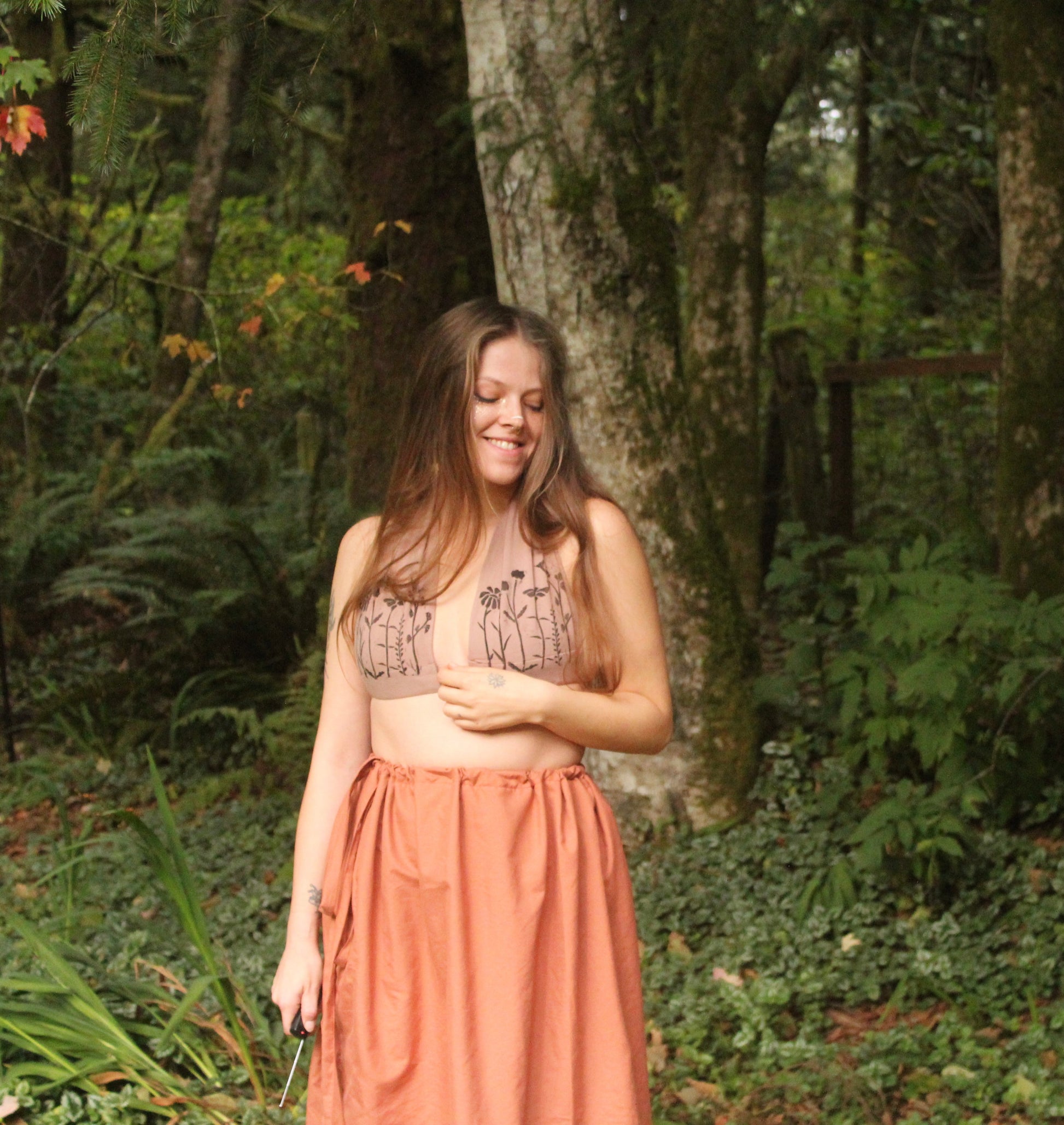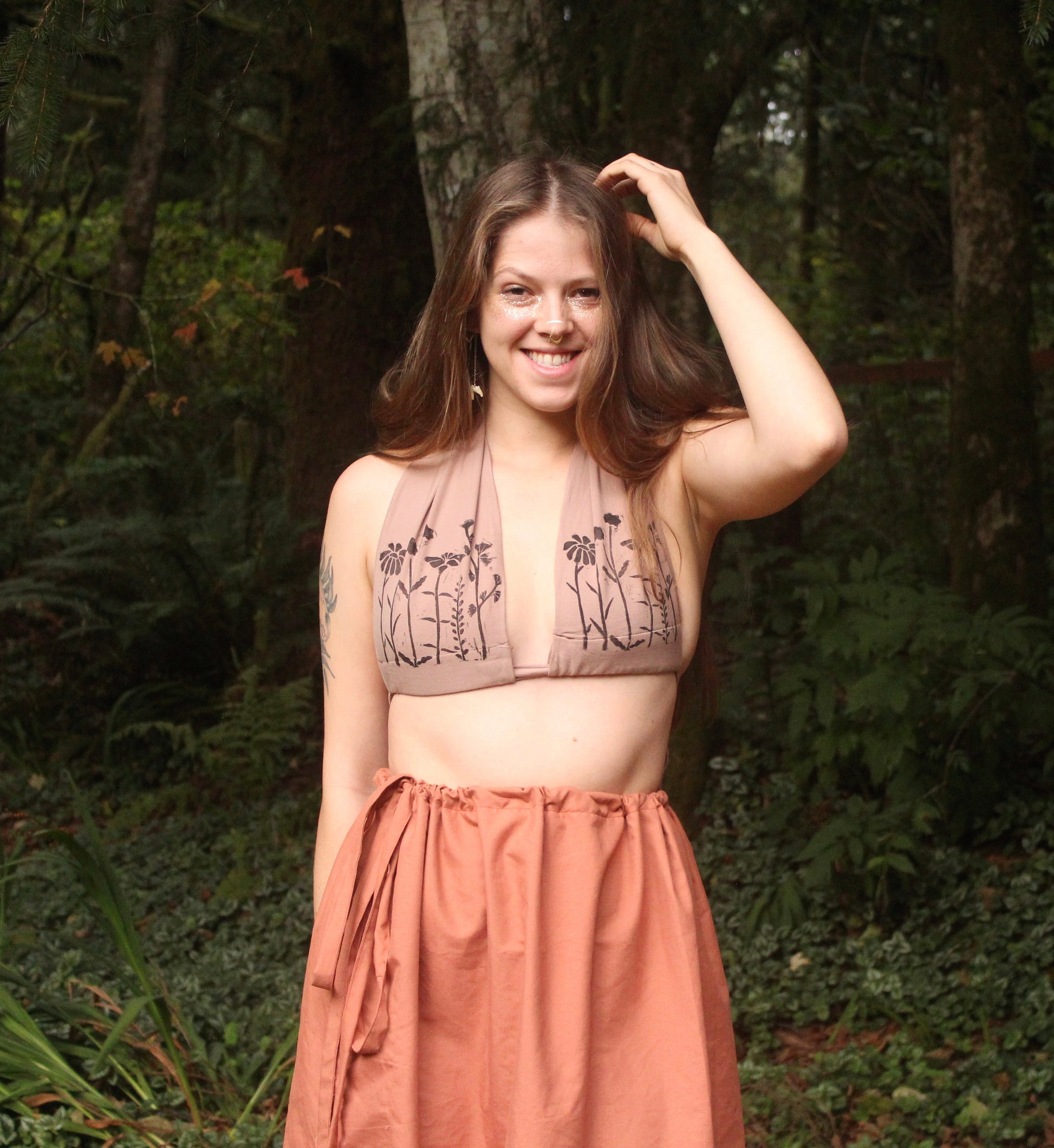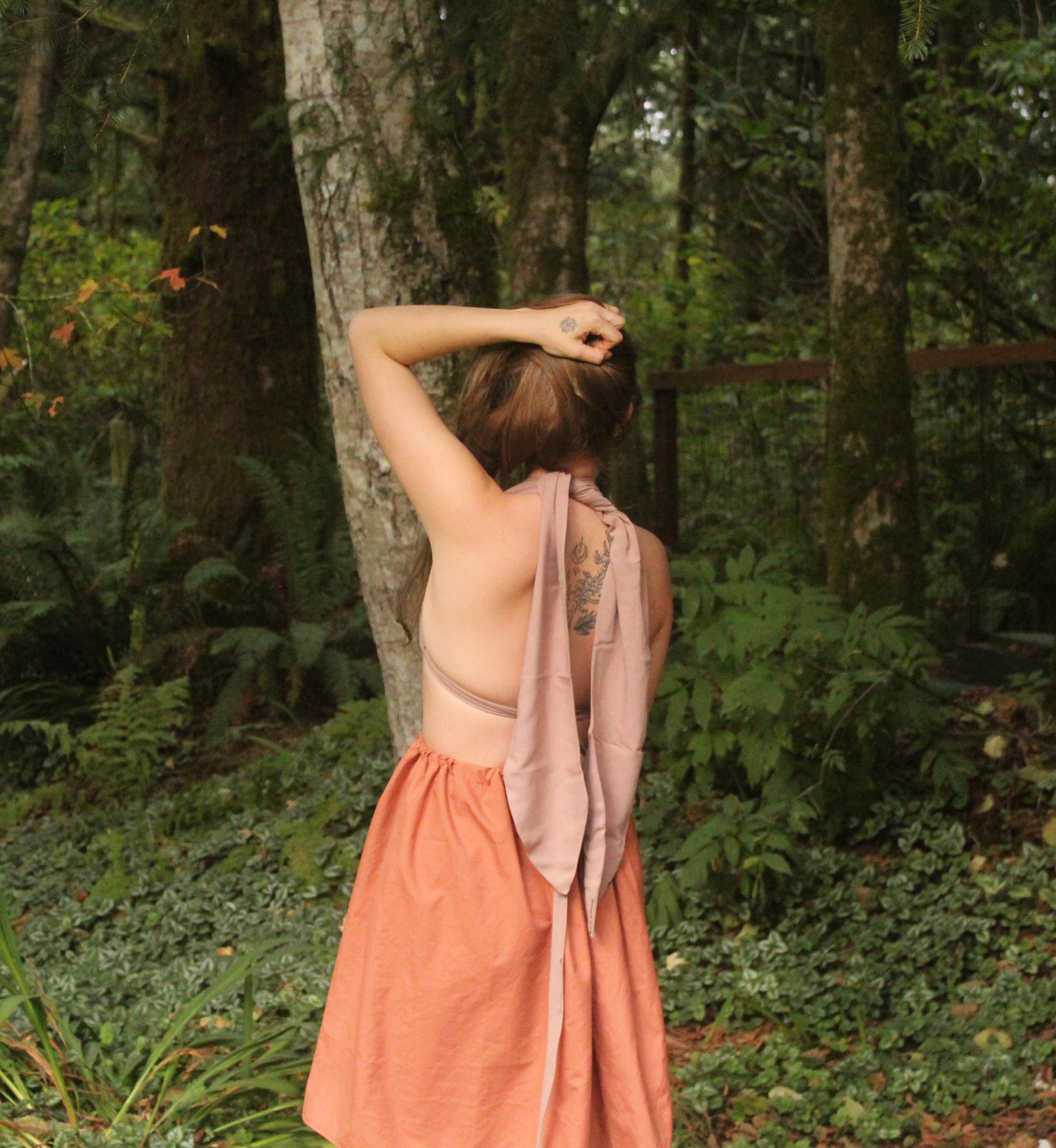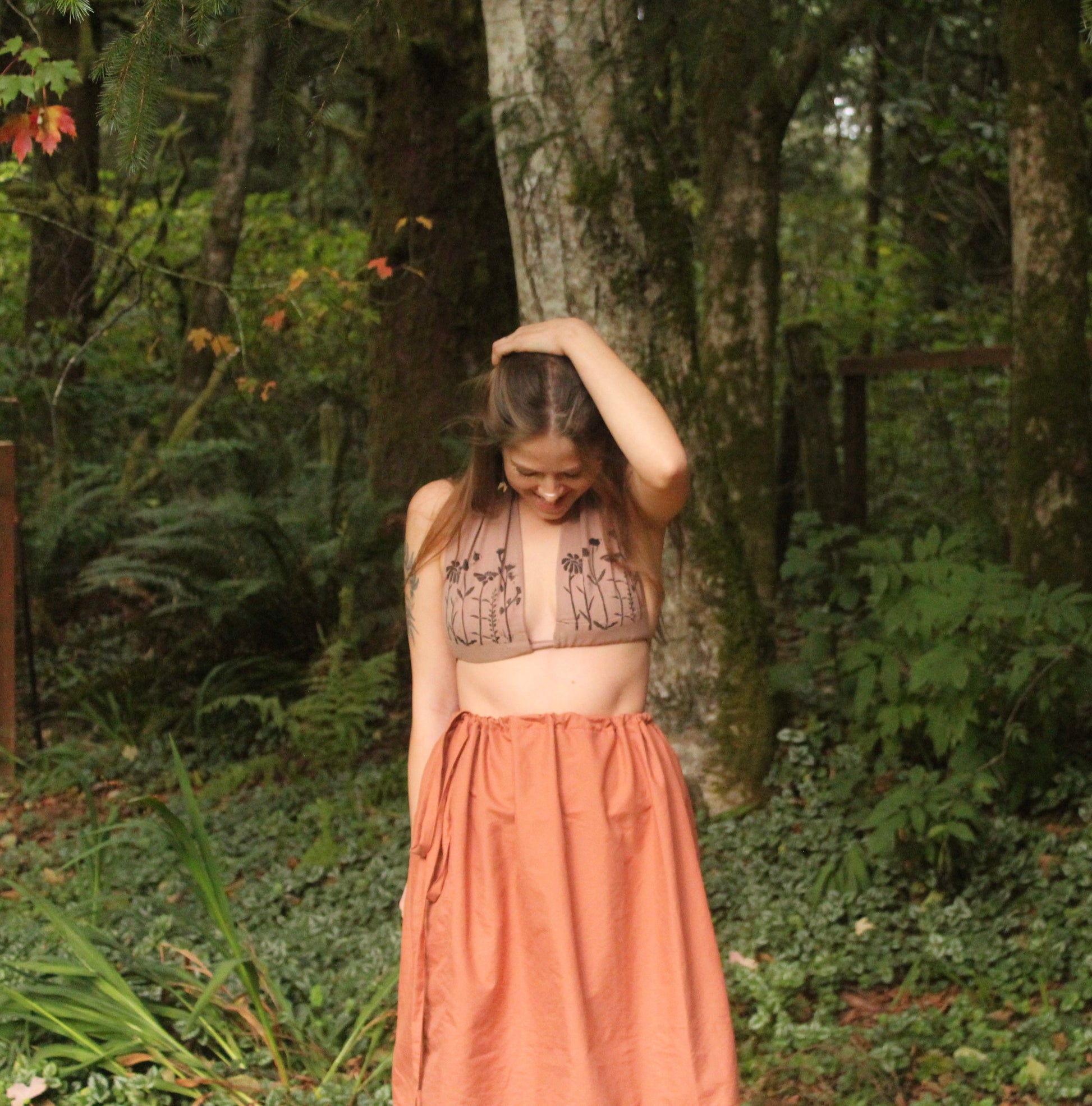 I created this clothing line with body positivity, sustainability and growth in mind. These shirts are a one size fits many as they are extremely adjustable and can be worn many ways, as are the skirts along side them. These pieces will last a lifetime and grow with you through all phases of life.